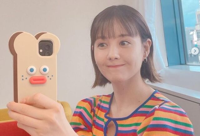 鏡を使った自撮りでスマホケースのキャラクターの顔マネを披露した。